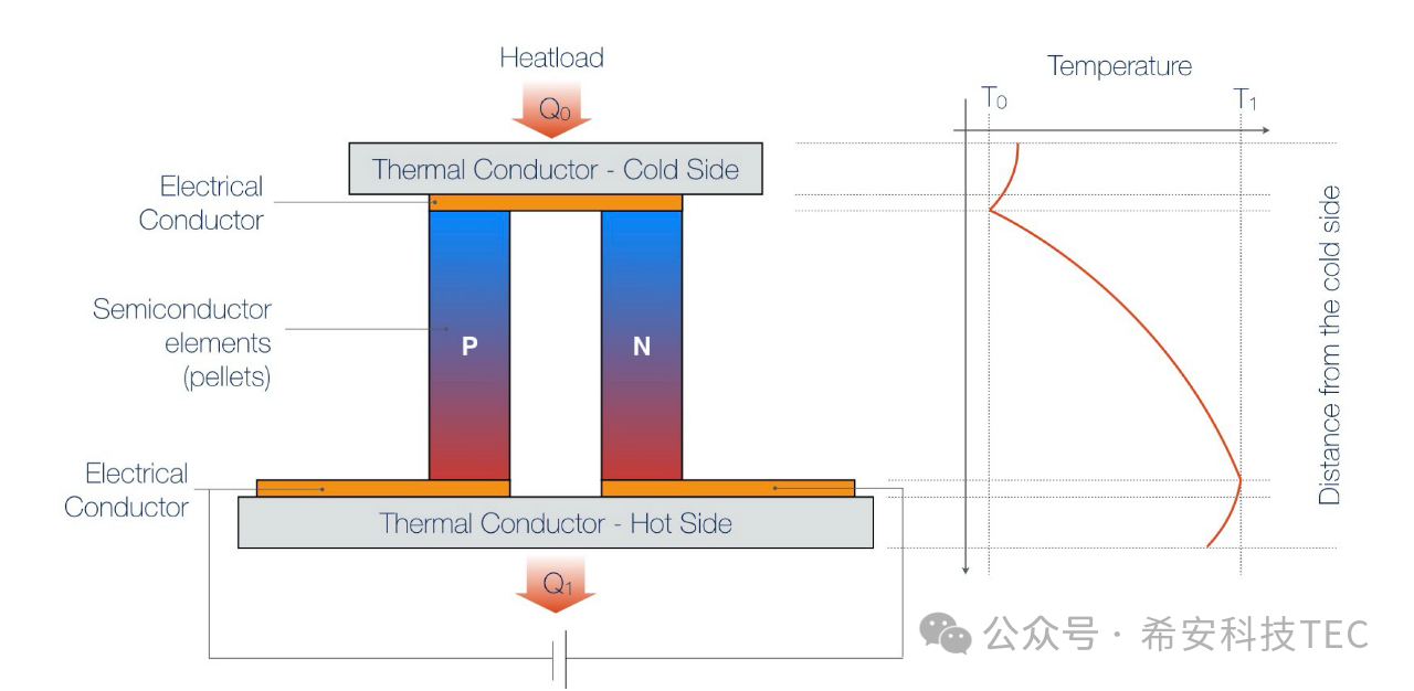 Termopaari mõlemasse otsa lisatakse soojusjuhid, nagu on näidatud järgmisel joonisel: moodustub täielik TEC. Kui TEC on sisse lülitatud, neelab ülemine pind soojust, mida nimetatakse külmaks otsaks, ja neeldunud soojus on Q0. Alumine pind eraldab soojust ja seda nimetatakse kuumaks pinnaks, kusjuures eralduv soojus on Q1 ; Q1= Q0+Qtec